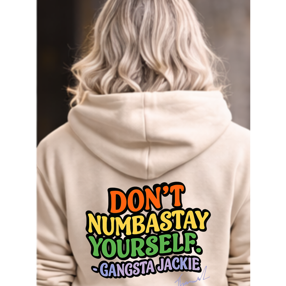 Jackie’s signature phrase “Don’t Numbastay Yourself” is your reminder to stay present, feel fully, and grow through what shows up. This retro colorful hoodie blends bold expression with everyday comfort — keeping you warm while calling you higher.